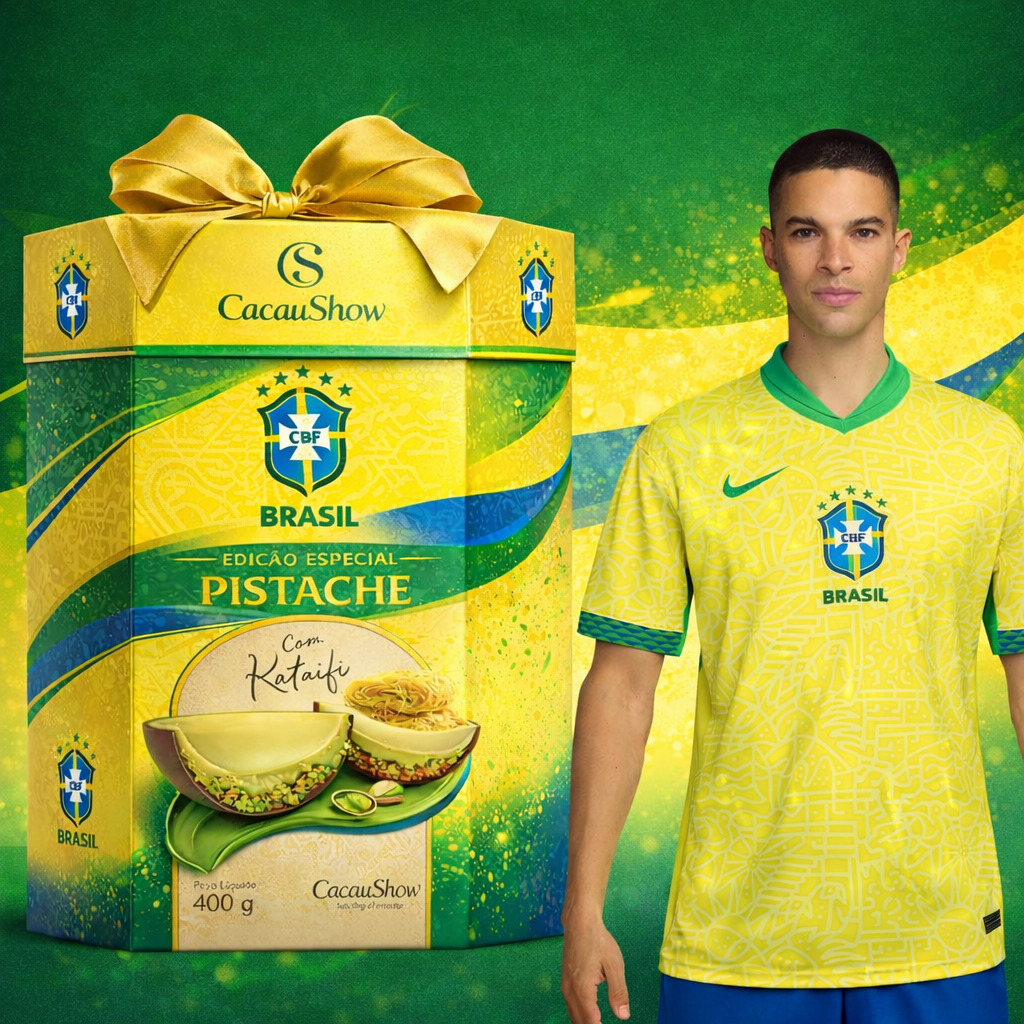 A **Cacau Show** e a **CBF** se unem para celebrar o que o Brasil tem de melhor: a nossa história nos gramados e a excelência do nosso chocolate. Inspirado na nova era da seleção, criamos o Ovo de Pistache Premium, com pedaços crocantes e recheio cremoso, simbolizando a riqueza da nossa terra.